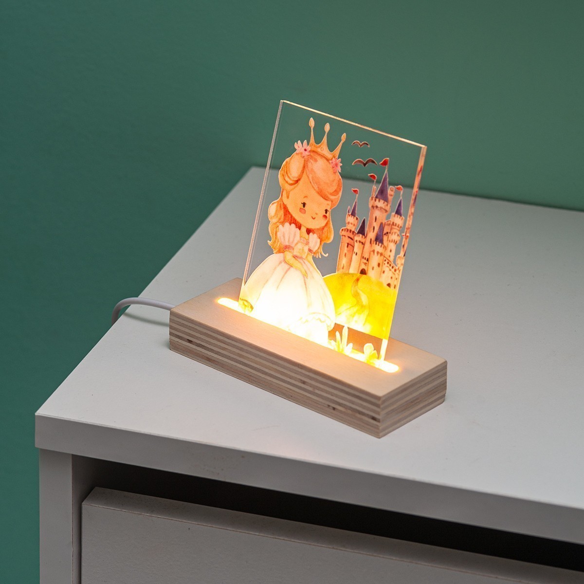 Ξύλινη βάση με Led φωτισμό και καδράκι από διάφανο plexiglass. Η παράσταση απεικονίζει την πριγκίπισσα του παραμυθιού με φόντο το κάστρο.