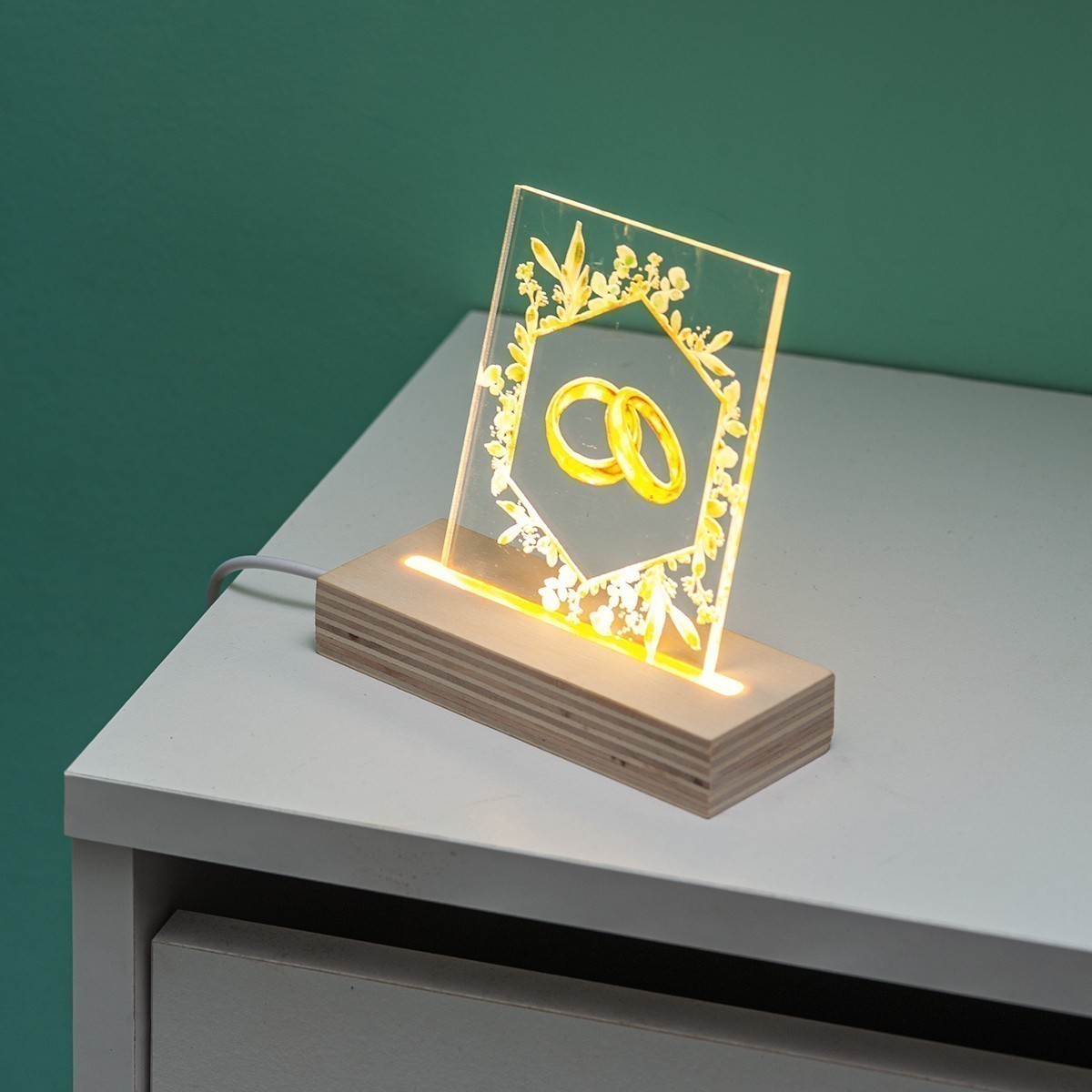 Ξύλινη βάση με Led φωτισμό και καδράκι από διάφανο plexiglass. Η παράσταση απεικονίζει χρυσές βέρες μέσα σε ένα στεφανάκι από πράσινο ευκάλυπτο.
