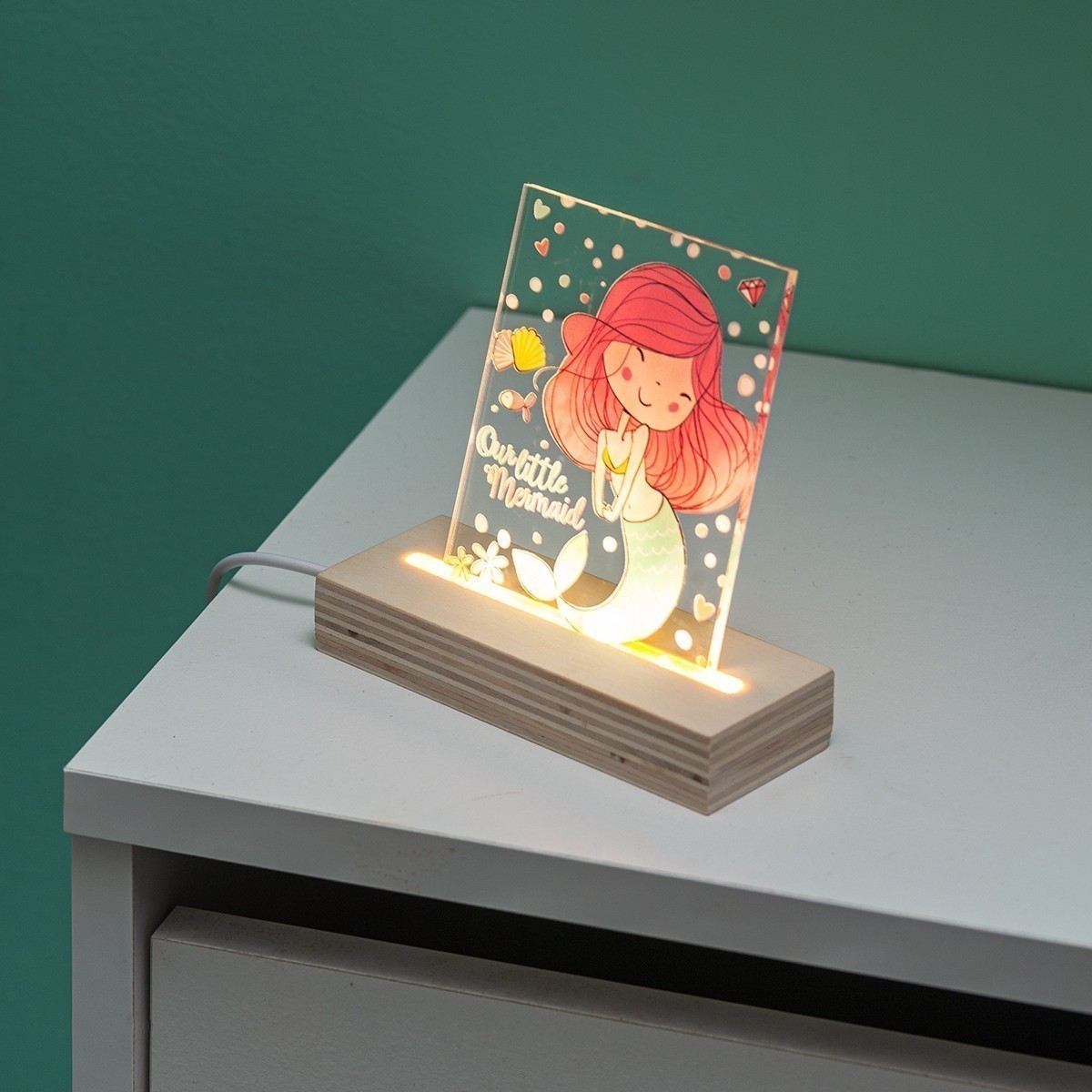 Ξύλινη βάση με Led φωτισμό και καδράκι από διάφανο plexiglass. Η παράσταση απεικονίζει τη γοργόνα.
