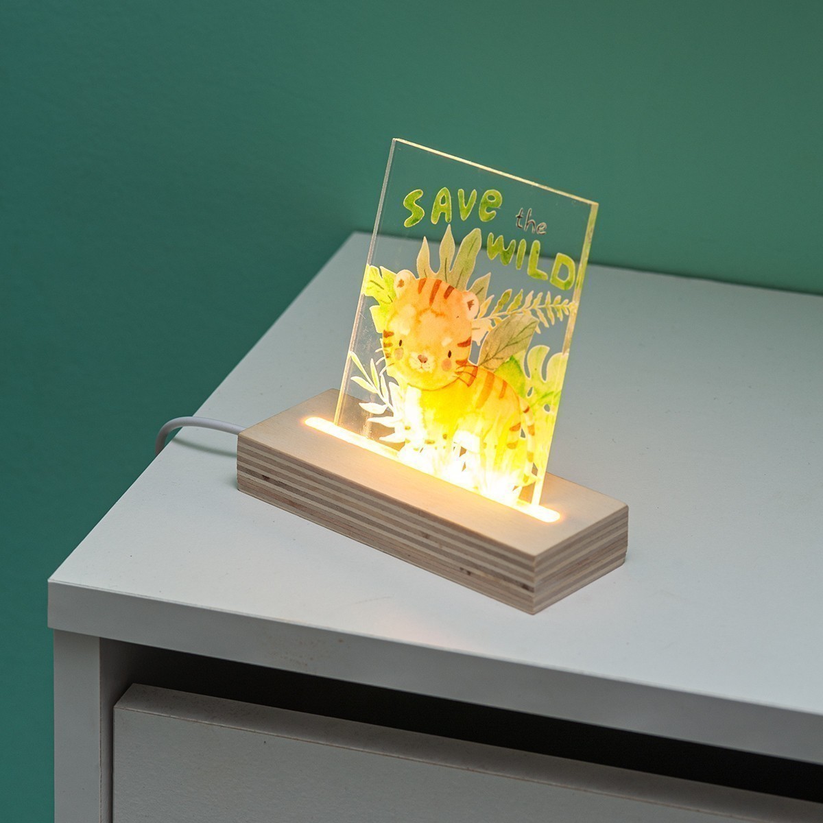 Ξύλινη βάση με Led φωτισμό και καδράκι από διάφανο plexiglass. Η παράσταση απεικονίζει την τίγρη μέσα σε πράσινα φυλώμματα να στέλνει το μήνυμα "Save the wild".