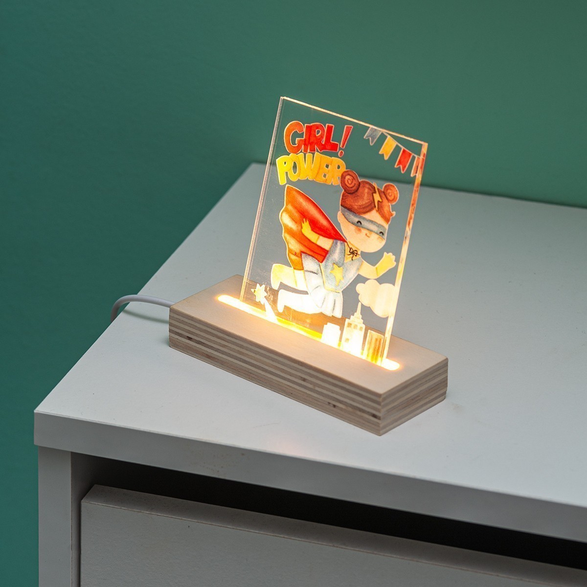 Ξύλινη βάση με Led φωτισμό και καδράκι από διάφανο plexiglass. Η παράσταση απεικονίζει την Super Girl power.
