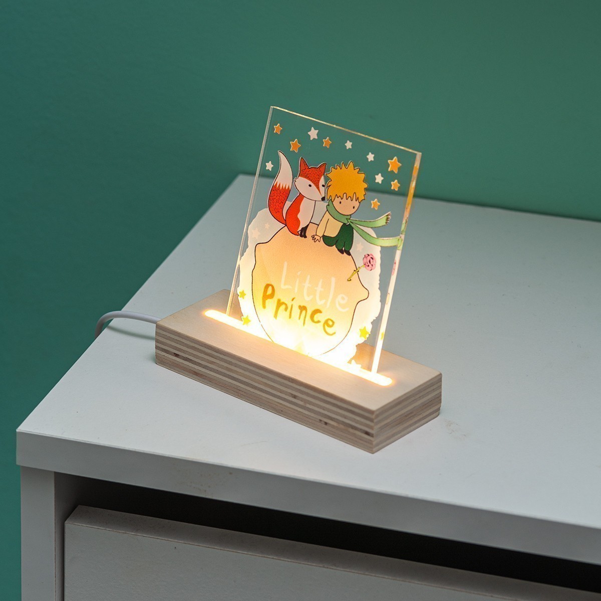 Ξύλινη βάση με Led φωτισμό και καδράκι από διάφανο plexiglass. Η παράσταση απεικονίζει την κλασσική φιγούρα του Μικρού Πρίγκιππα από το παραμύθι.