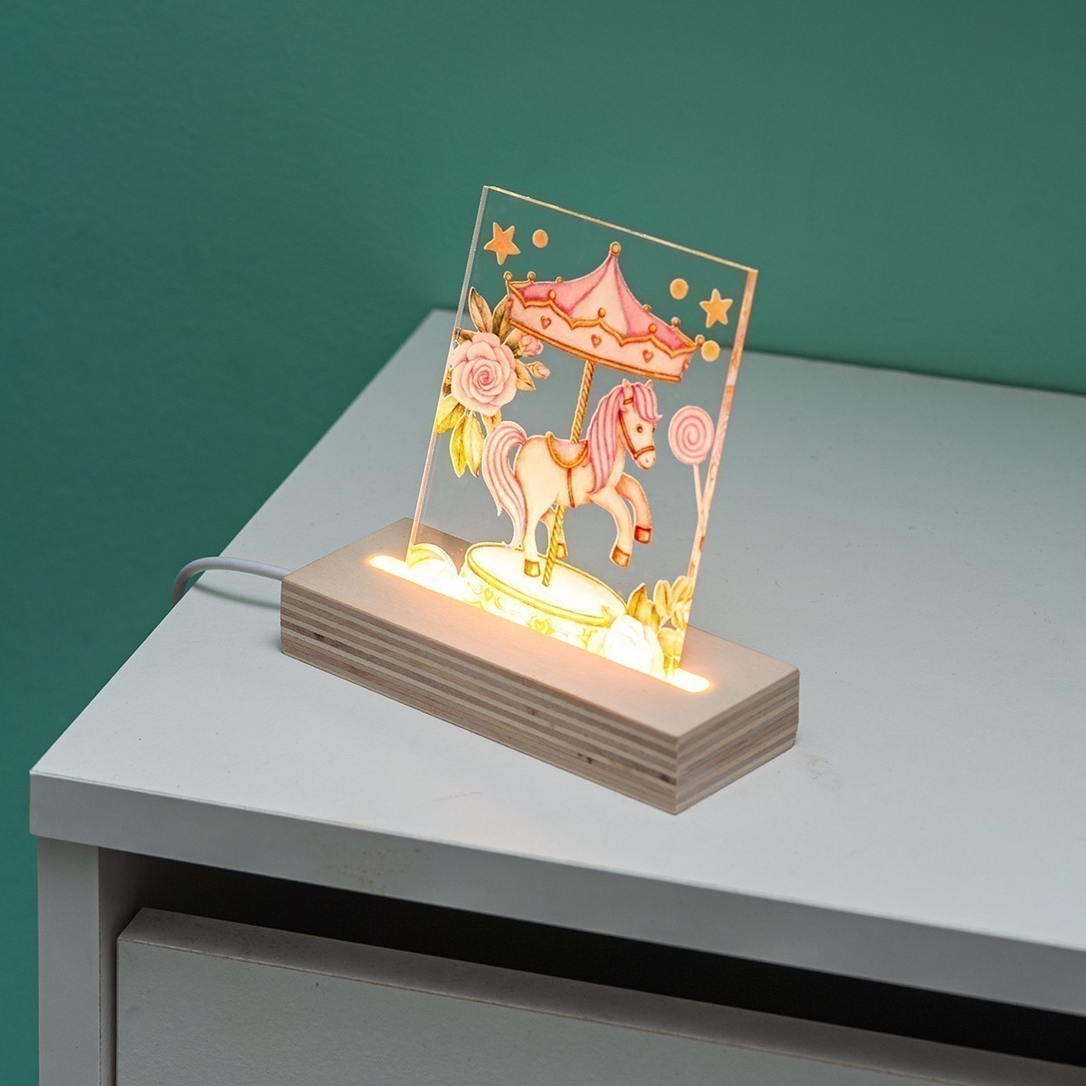 Ξύλινη βάση με Led φωτισμό και καδράκι από διάφανο plexiglass. Η παράσταση απεικονίζει ένα ροζ καρουζέλ.