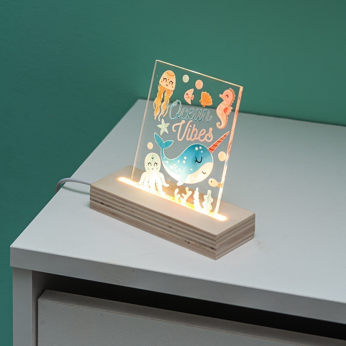 Ξύλινη βάση με Led φωτισμό και καδράκι από διάφανο plexiglass. Η παράσταση απεικονίζει το βυθό με τη φάλαινα, τη μέδουσα, το χταπόδι και τον ιππόκαμπο σε "Ocean Vibes".