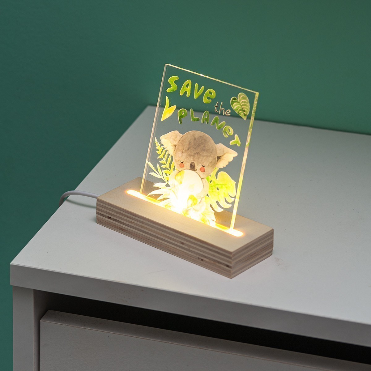 Ξύλινη βάση με Led φωτισμό και καδράκι από διάφανο plexiglass. Η παράσταση απεικονίζει το κοάλα αγκαλιά με την υδρόγειο να στέλνει το μήνυμα "Save the Planet".