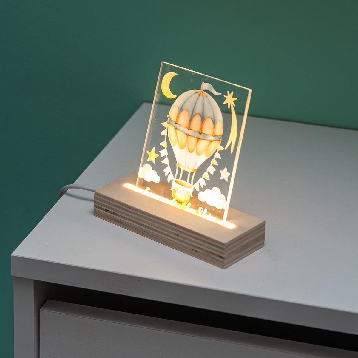 Ξύλινη βάση με Led φωτισμό και καδράκι από διάφανο plexiglass. Η παράσταση απεικονίζει το αερόστατο σε σιέλ αποχρώσεις δίνοντας το σύνθημα " Escape to the skies".