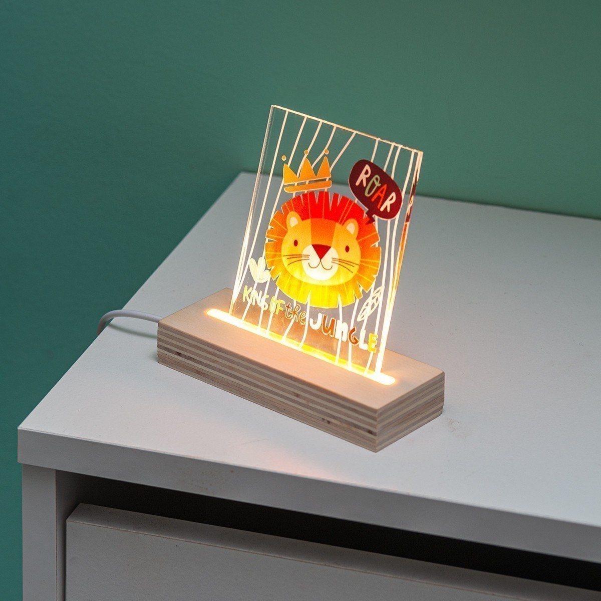 Ξύλινη βάση με Led φωτισμό και καδράκι από διάφανο plexiglass. Η παράσταση απεικονίζει το λιονταράκι ως "King of the jungle".