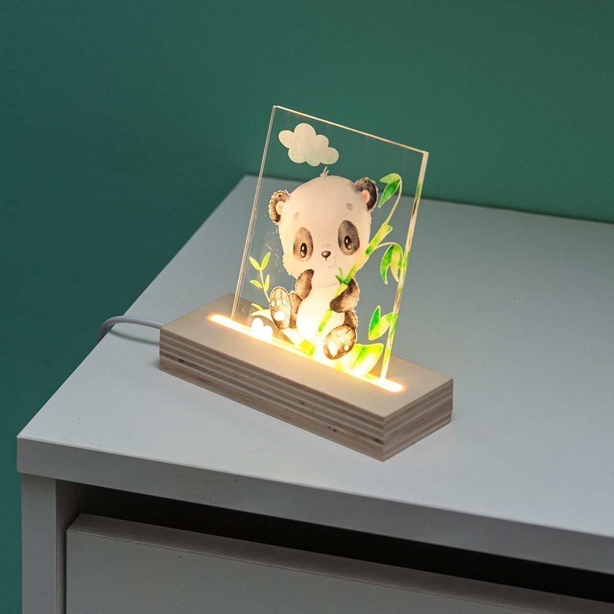 Ξύλινη βάση με Led φωτισμό και καδράκι από διάφανο plexiglass. Η παράσταση απεικονίζει την κλασσική φιγούρα του panda με τον ευκάλυπτο.