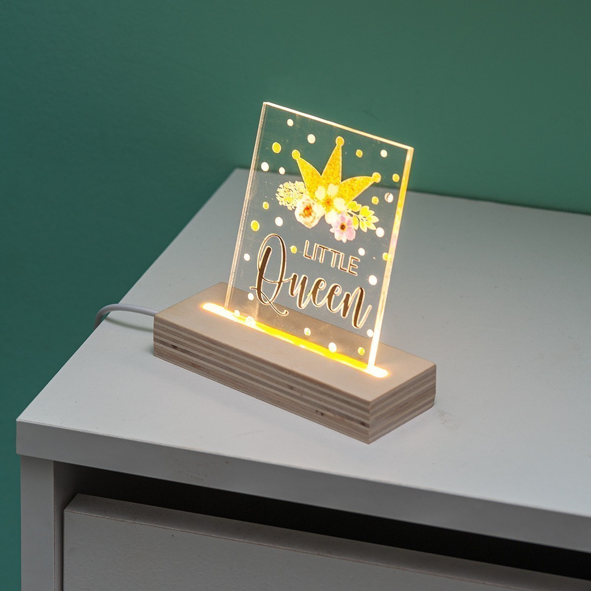 Ξύλινη βάση με Led φωτισμό και καδράκι από διάφανο plexiglass. Η παράσταση απεικονίζει την κορώνα της "Little Queen".