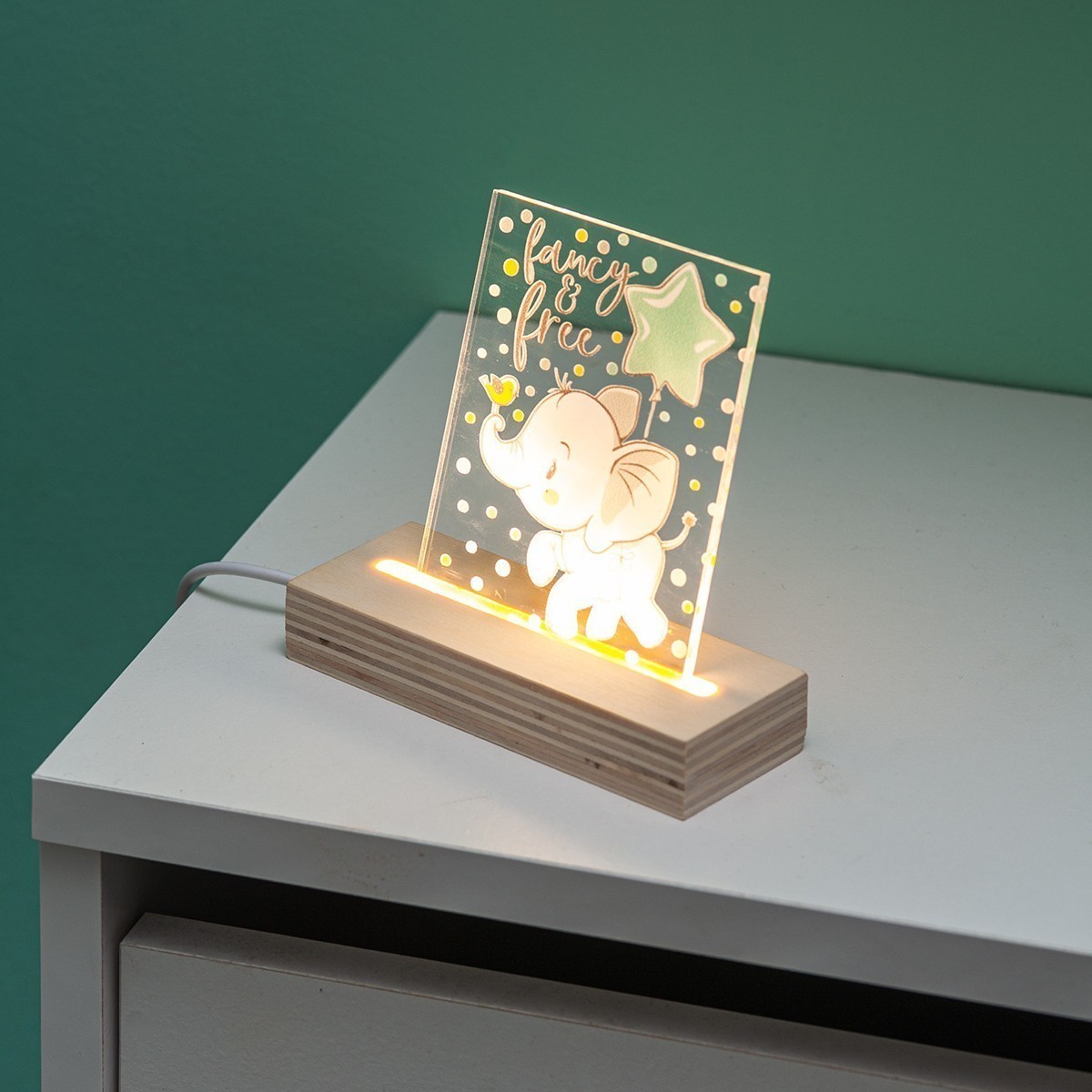 Ξύλινη βάση με Led φωτισμό και καδράκι από διάφανο plexiglass. Η παράσταση απεικονίζει το ελεφαντάκι με το μπαλόνι να είναι fancy & free.