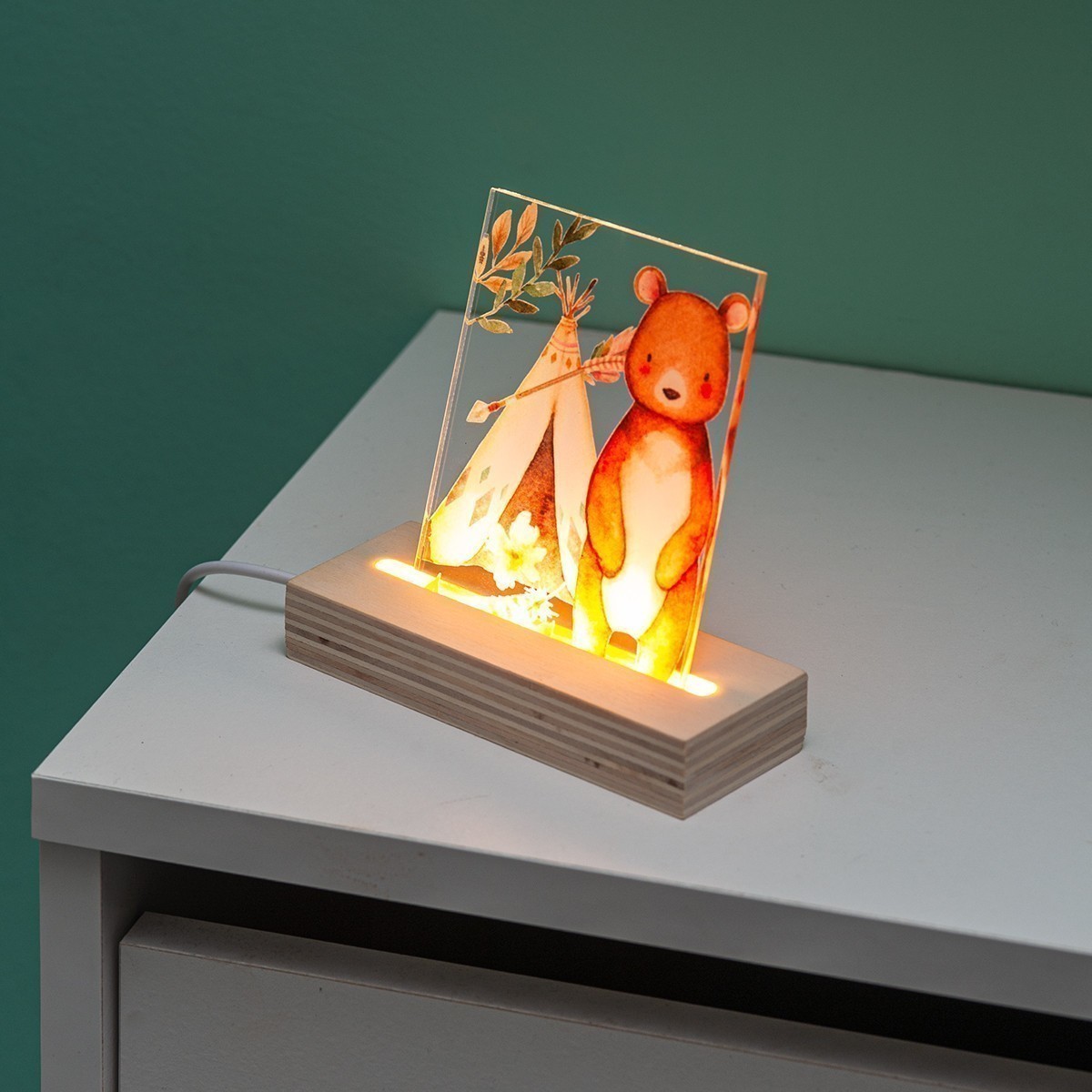 Ξύλινη βάση με Led φωτισμό και καδράκι από διάφανο plexiglass. Η παράσταση απεικονίζει την αρκουδίτσα σε boho style.