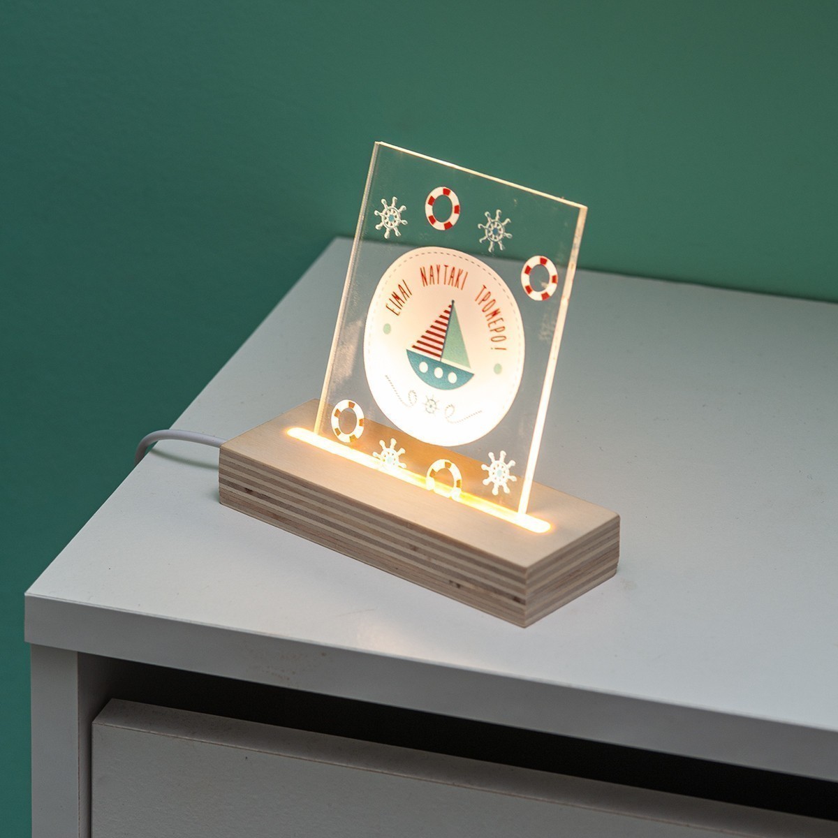 Ξύλινη βάση με Led φωτισμό και καδράκι από διάφανο plexiglass. Η παράσταση απεικονίζει το κλασσικό ναυτικό θέμα με το καραβάκι και moto "είμαι ναυτάκι τρομερό".