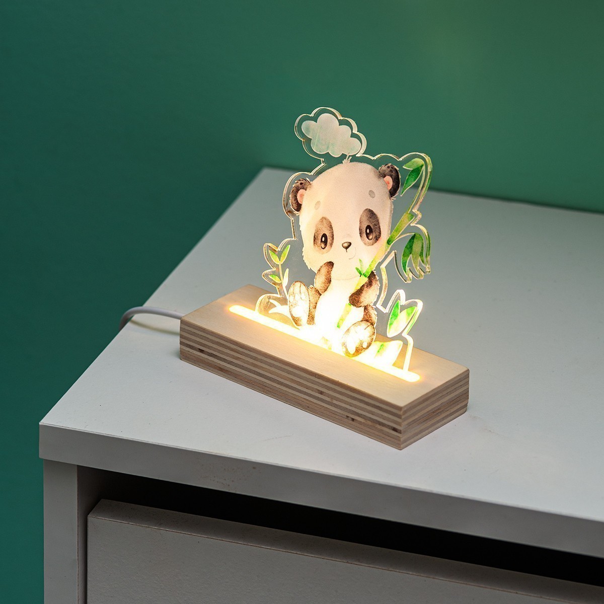 Ξύλινη βάση με Led φωτισμό και καδράκι από διάφανο plexiglass. Η παράσταση απεικονίζει την κλασσική φιγούρα του panda με τον ευκάλυπτο.