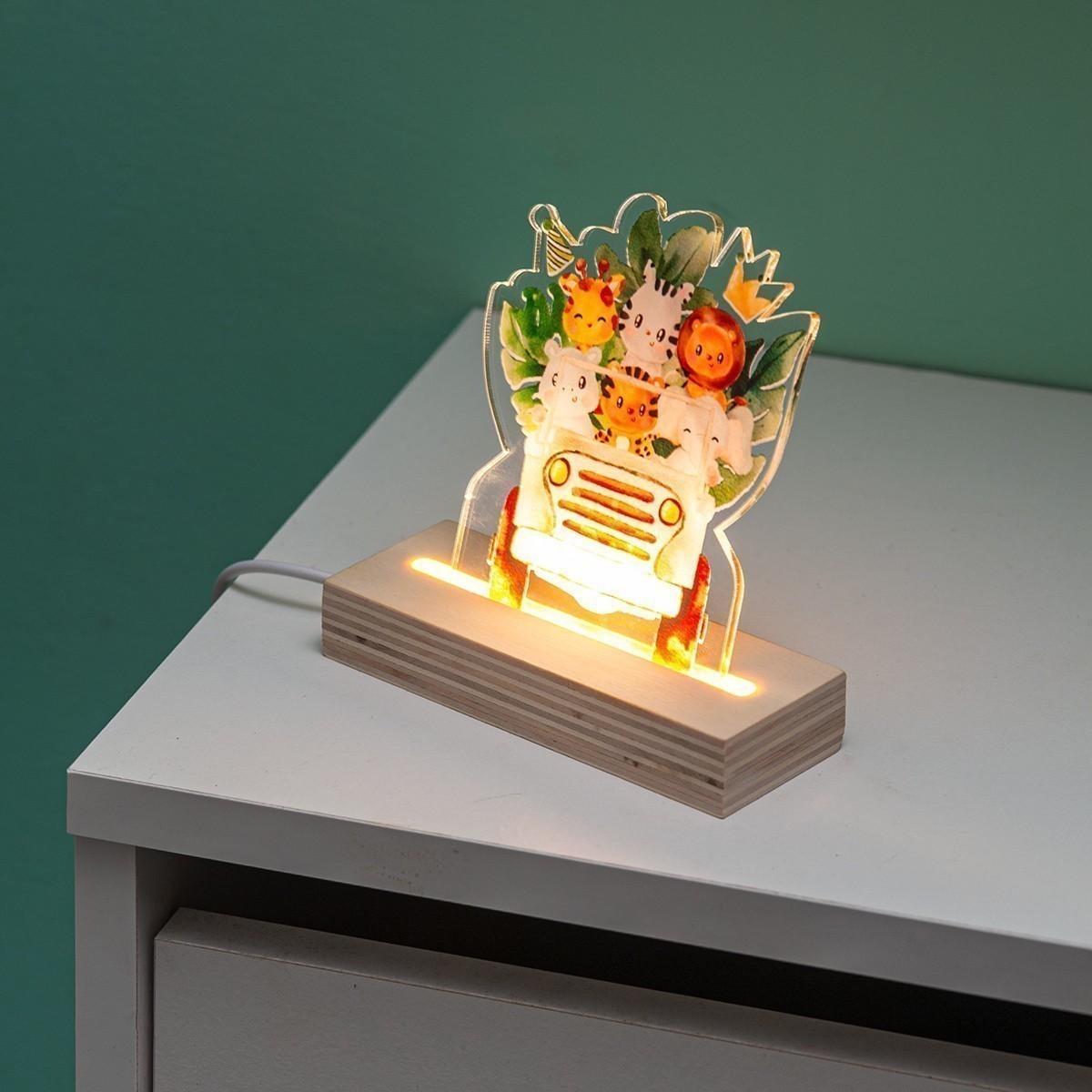 Ξύλινη βάση με Led φωτισμό και καδράκι από διάφανο plexiglass. Η παράσταση απεικονίζει τα ζωάκια της ζούγκλας να πηγαίνουν για safari.