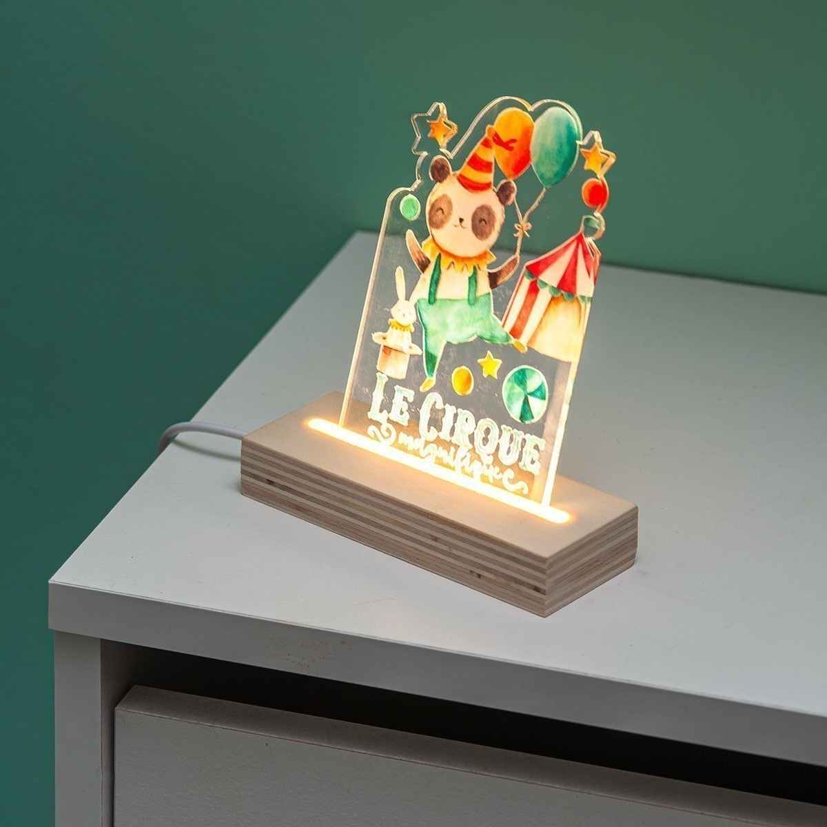 Ξύλινη βάση με Led φωτισμό και καδράκι από διάφανο plexiglass. Η παράσταση απεικονίζει το panda να κάνει ακροβατικά στο τσίρκο.