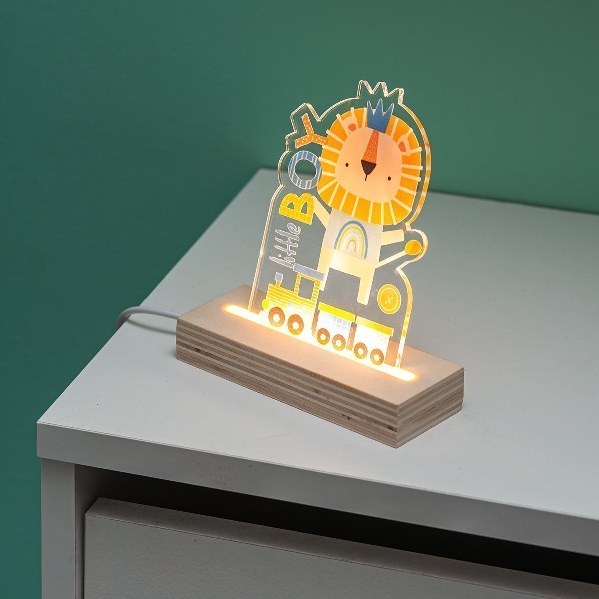 Ξύλινη βάση με Led φωτισμό και καδράκι από διάφανο plexiglass. Η παράσταση απεικονίζει ένα λιονταράκι σε σιέλ αποχρώσεις.