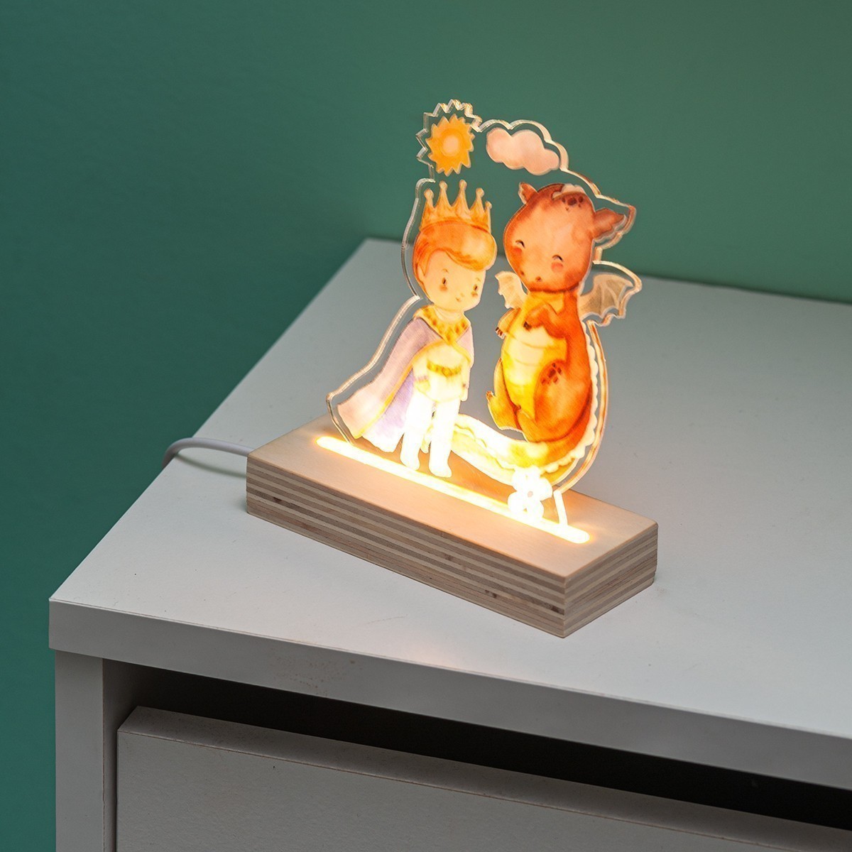 Ξύλινη βάση με Led φωτισμό και καδράκι από διάφανο plexiglass. Η παράσταση απεικονίζει τον πρίγκιππα παρέα με τον δράκο του παραμυθιού.