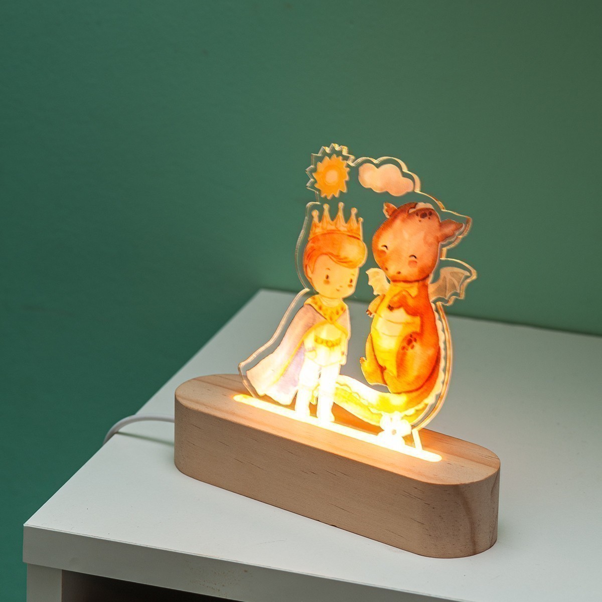 Ξύλινη βάση με Led φωτισμό και καδράκι από διάφανο plexiglass. Η παράσταση απεικονίζει τον πρίγκιππα παρέα με τον δράκο του παραμυθιού.