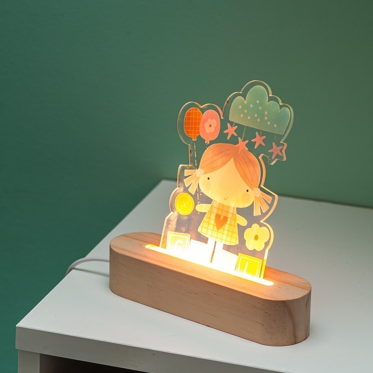Ξύλινη βάση με Led φωτισμό και καδράκι από διάφανο plexiglass. Η παράσταση απεικονίζει ένα κοριτσάκι σε ροζ girlish αποχρώσεις.