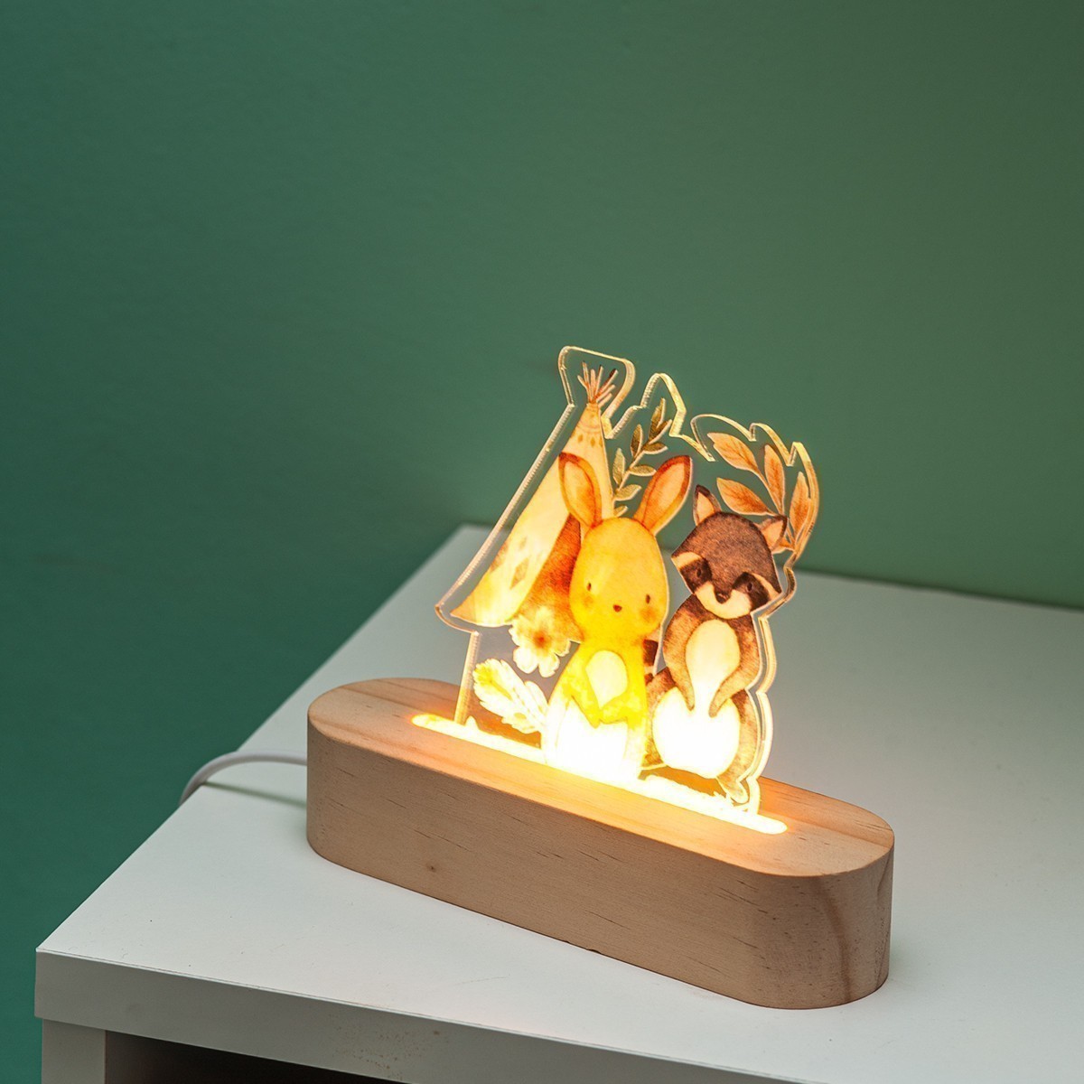 Ξύλινη βάση με Led φωτισμό και καδράκι από διάφανο plexiglass. Η παράσταση απεικονίζει την αλεπού και το λαγουδάκι σε boho style.