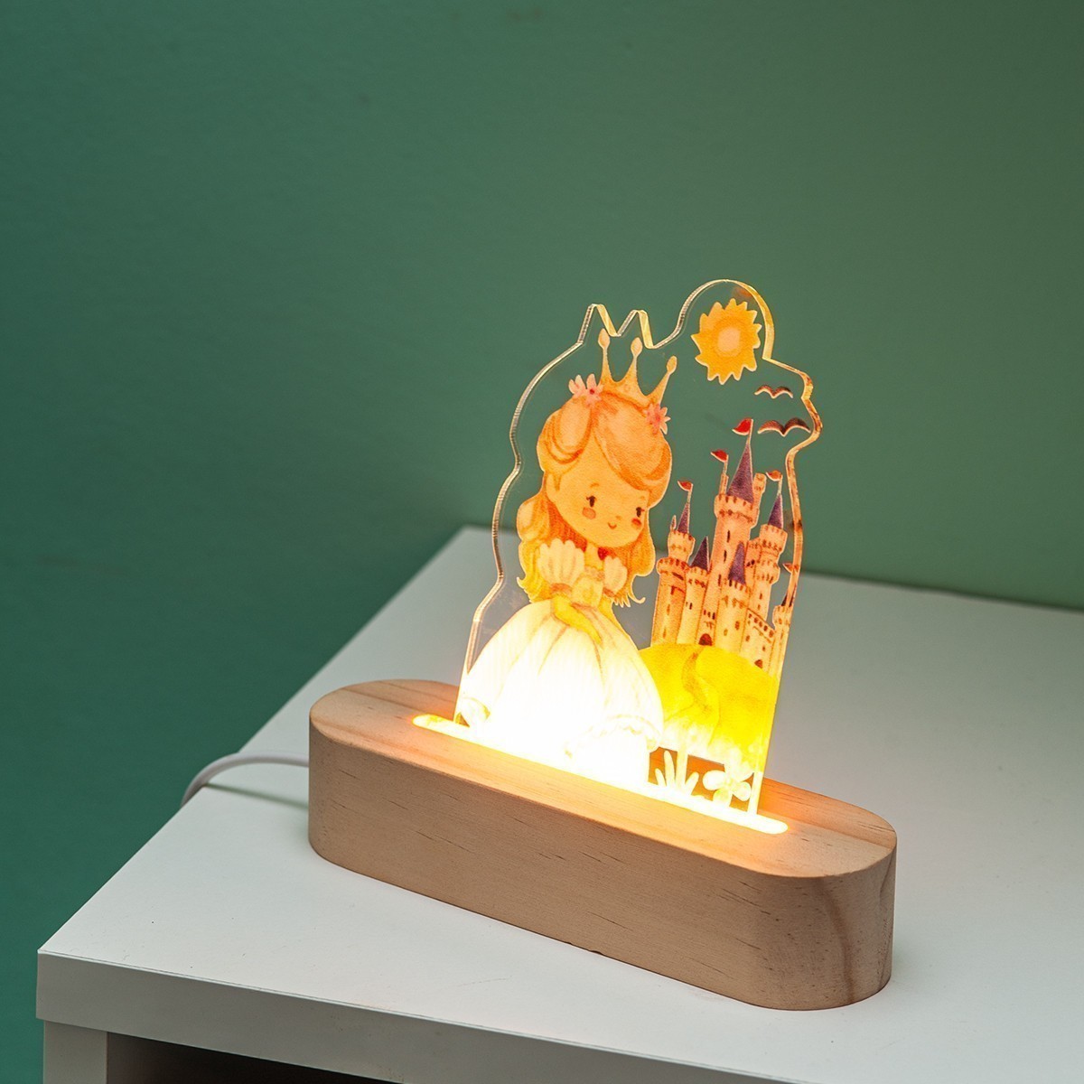 Ξύλινη βάση με Led φωτισμό και καδράκι από διάφανο plexiglass. Η παράσταση απεικονίζει την πριγκίπισσα του παραμυθιού με φόντο το κάστρο .