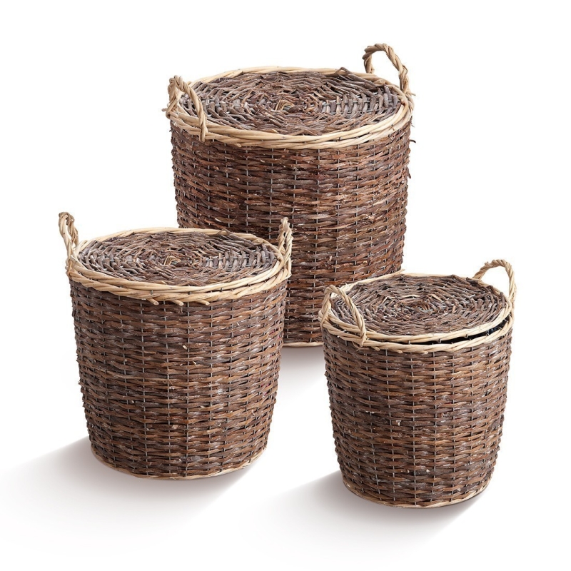 Καλάθια Μπαμπού Καλάθια μπαμπού με καπάκι σετ 3 τεμαχίων. Τα καλάθια έχουν στρογγυλό σχήμα με σταθερή πλέξη και το χρώμα τους είναι καφέ.