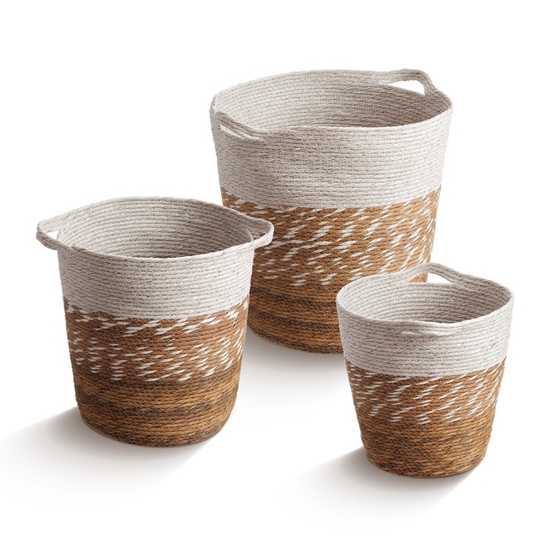 Καλάθια Μπαμπού Καλάθια μπαμπού σετ 3 τεμαχίων. Τα καλάθια έχουν στρογγυλό σχήμα με μαλακή πλέξη και το χρώμα τους είναι συνδυασμός φυσικών και εκρού αποχρώσεων.