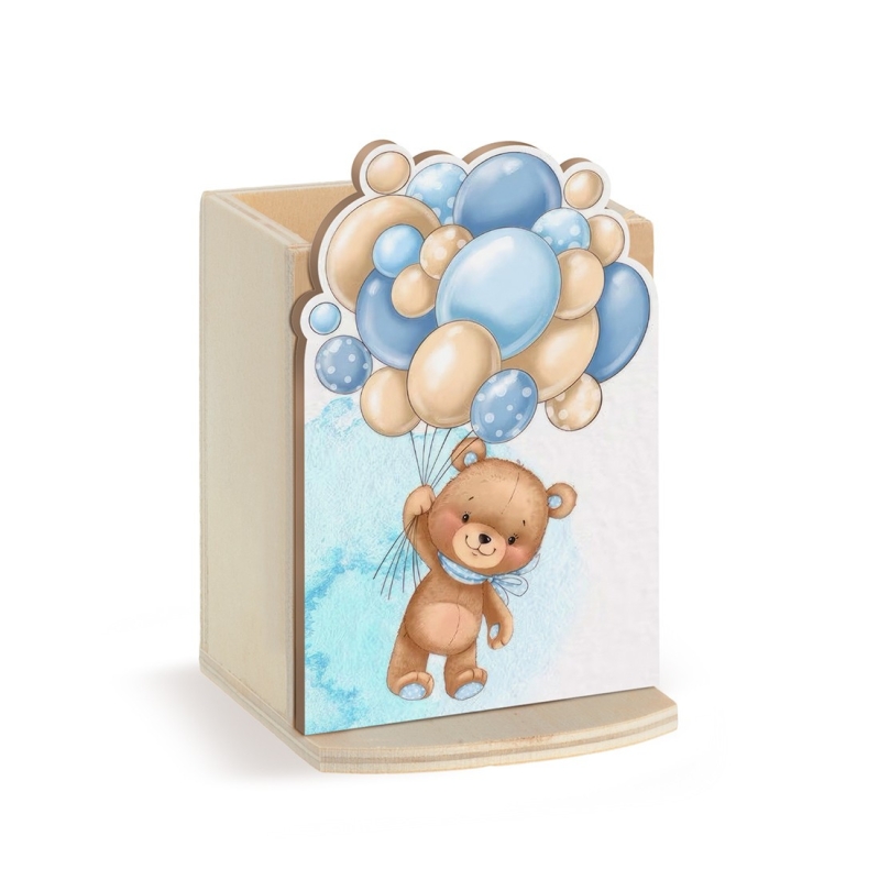 Ξύλινη μολυβοθήκη σε natural χρώμα. Διακοσμημένο με κοπτικό αρκουδάκι με σιελ μπαλόνια.