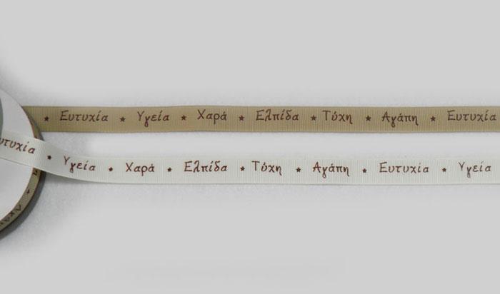 Κορδέλα Γκρο με ευχές σε 2 αποχρώσεις με καφέ τύπωμα. Διάσταση 1.5 εκ x 23 μέτρα.