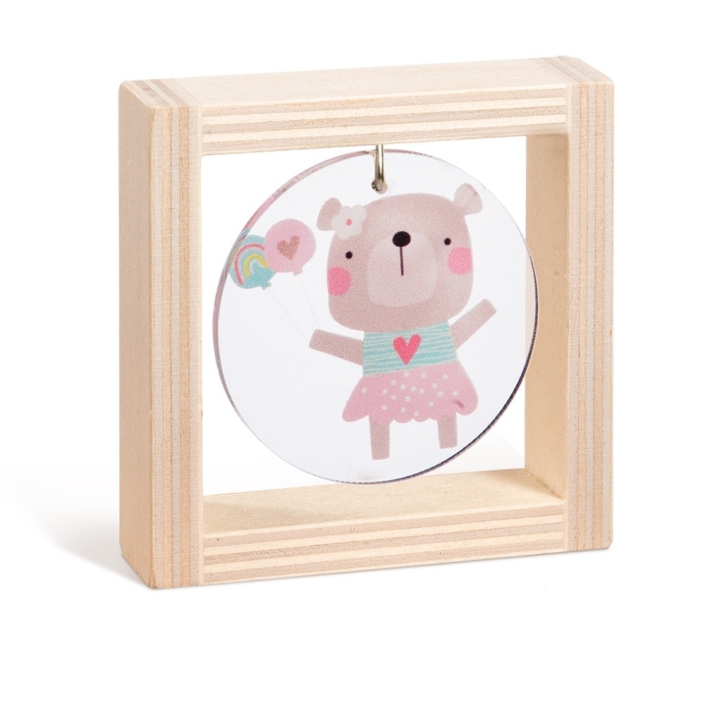 Ξύλινο τετράγωνο καδράκι με στρογγυλή print παράσταση από plexiglass σε διάφανο χρώμα. Η παράσταση απεικονίζει την αρκουδίνα να κρατάει μπαλόνια σε ροζ αποχρώσεις.