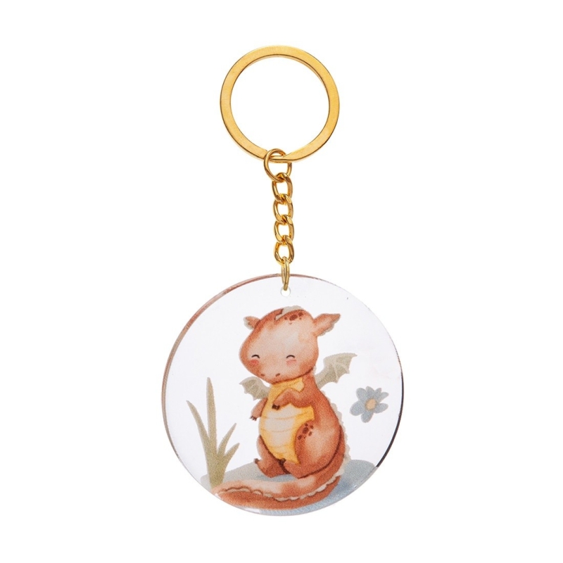 Μπρελόκ με στρογγυλή print παράσταση από plexiglass σε διάφανο χρώμα. Η παράσταση απεικονίζει τον δράκο του παραμυθιού.