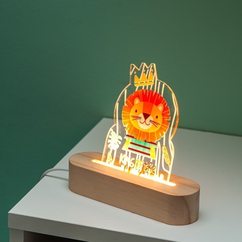 Ξύλινη βάση με Led φωτισμό και καδράκι από διάφανο plexiglass. Η παράσταση απεικονίζει το λιονταράκι ως "King of the jungle".