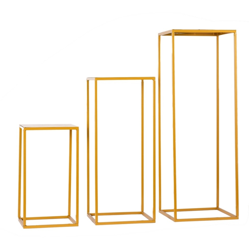 Σετ τριών μεταλλικών βάσεων σε χρυσό φινίρισμα.Ιδανικές για διακόσμηση γάμων, βαπτίσεων, εκδηλώσεων και βιτρινών.Κατάλληλες για προβολή λουλουδιών, μπομπονιέρων και διακοσμητικών αντικειμένων.Διαστάσεις: Μικρή: 22cm x 40cm ύψοςΜεσαία: 25cm x 60cm ύψοςΜεγάλη: 28cm x 80cm ύψοςΥλικό: Μέταλλο βαμμένο | Διαστάσεις: